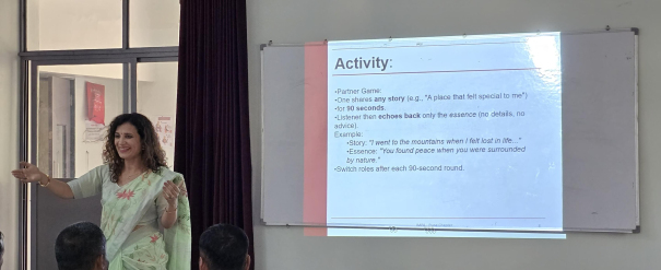 She began with a lively icebreaker—the classic “Chinese Whisper” game—to highlight the importance of attentive and accurate listening. She then introduced the LISTEN Model, a practical tool that participants could easily apply in their daily lives. Through an engaging group activity, she demonstrated how to use the model effectively, encouraging hands-on learning and reflection.